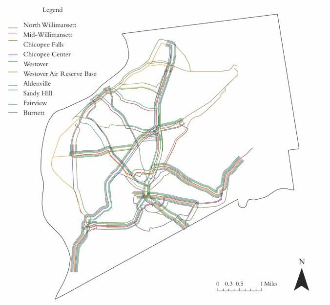 Chicopee transportation infrastructure is highly tailored to cars, with the most heavily trafficked roads running north to south. Similarly, most bus routes run north to south, with only one route running east to west in the southern part of the city. This prevents residents with limited car access from getting to and from desirable destinations. Additionally, the bus schedule has long intervals between buses, ranging between 20 and 60 minutes (PVTA), making public transportation unreliable. The incomplete, fragmented off-street bike and walking paths do not provide useful alternatives to the public transportation network. The existing paths are isolated from one another, further limiting city-wide, multi-modal connectivity. Residents might prefer driving to work because of the lack of east/west bus routes and an infrequent bus schedule. Connecting the fragmented bike trails within Chicopee would provide an alternative mode of transportation. Multi-modal streets could run parallel to or along major arteries in the city, allowing residents to access significant locations without waiting for public transport or using a car for shorter excursions.