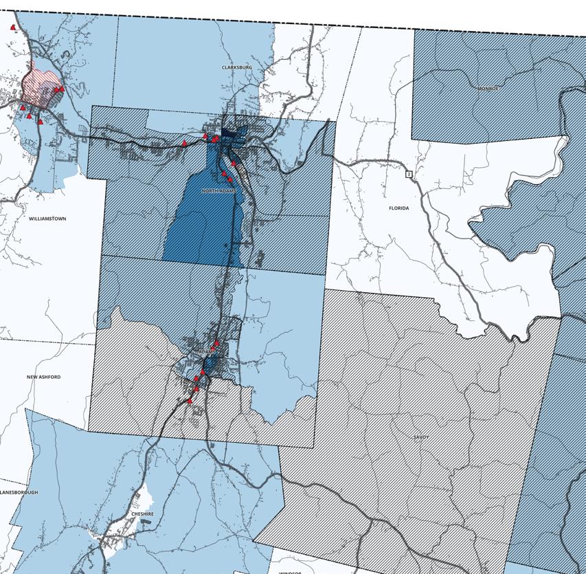 Commercial properties in town are extremely limited, with the two largest parcels operated by the Blue Vista Motor Lodge and Pan Am Southern LLC, which is associated with the Hoosac Tunnel. Other commercial ownerships are limited to Dobbert Recycling, and what appears to be an outof-business roadside store.