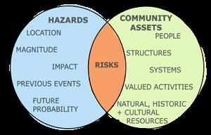 Risk: the potential for damage or loss created by the interaction of natural hazards with community assets, such as infrastructure or cultural resources. Risk is the overlap between hazards and community assets. The bigger the overlap, the higher the risk.