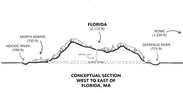 Florida is located atop the Hoosac Mountain Range, an extension of the Green Mountains down from Vermont which is part of the Appalachian range, and has steep and rugged terrain. Florida contains the villages of Drury, Florida, and Whitcomb Summit. Its highest point is Whitcomb Summit at 2,172’. Due to its high elevation, Florida is cooler and residents note that it receives more snow than much of the rest of the state.