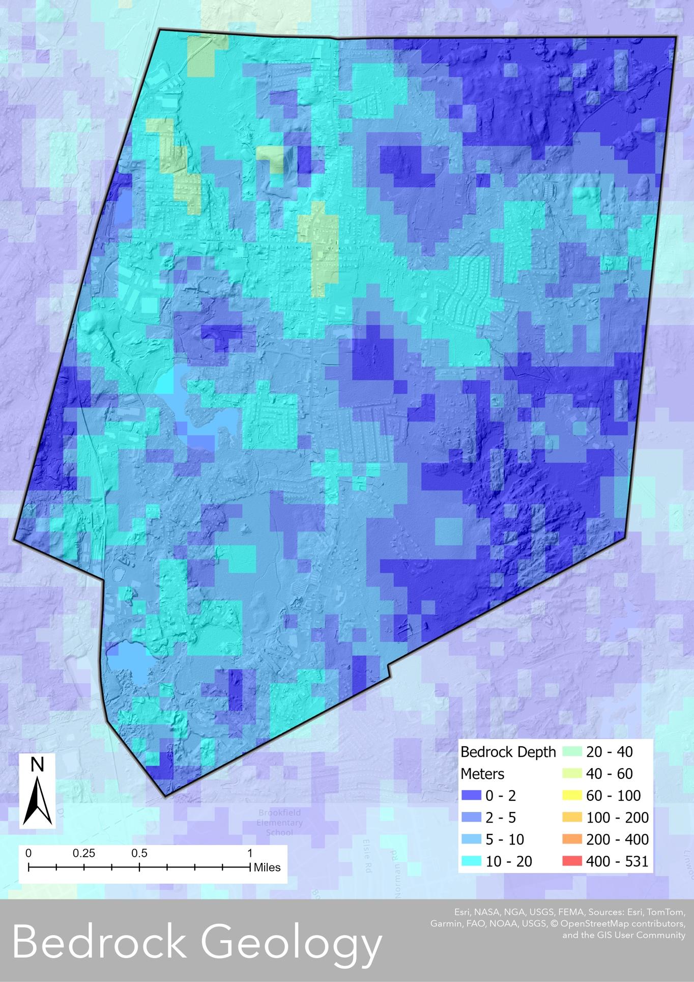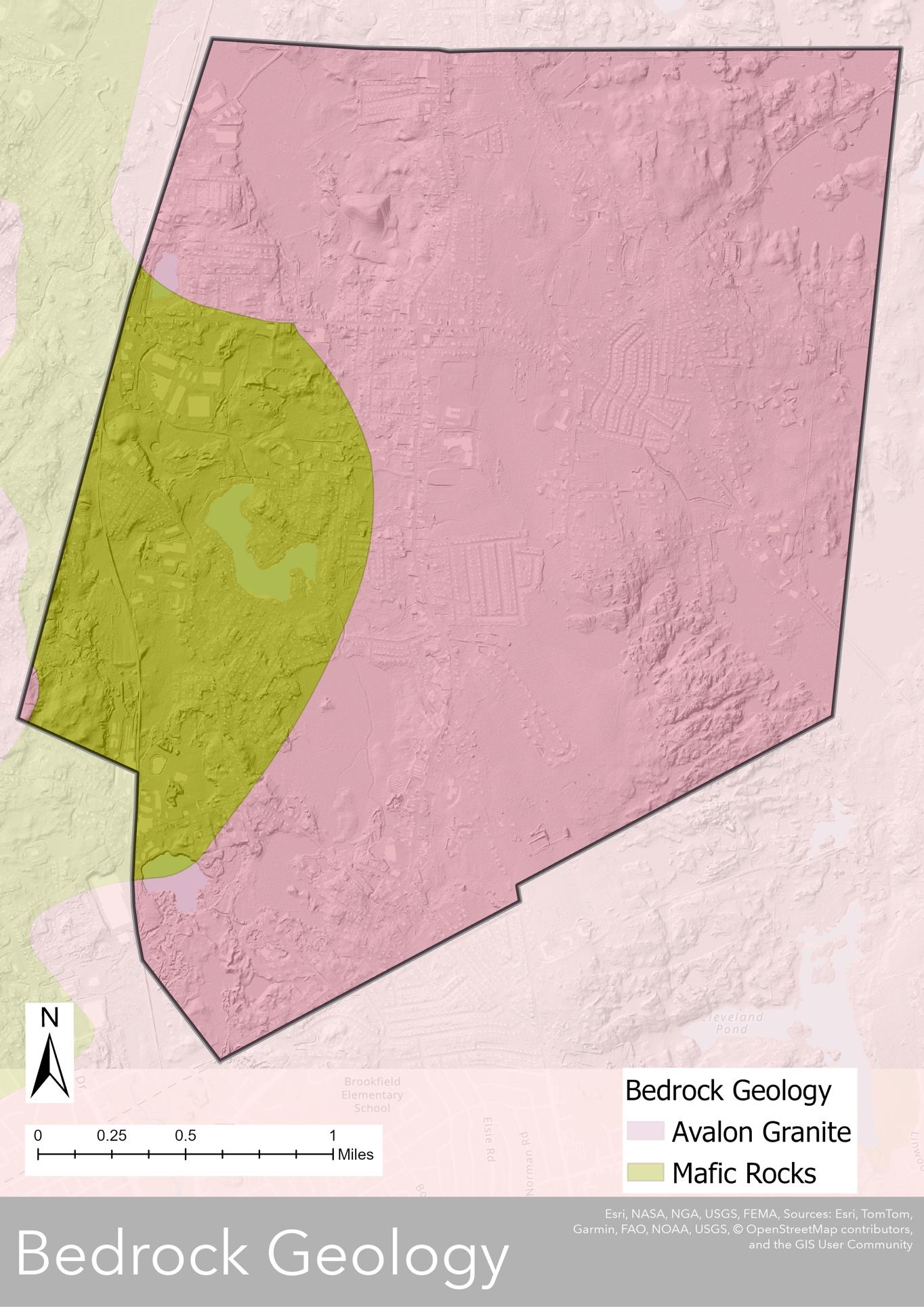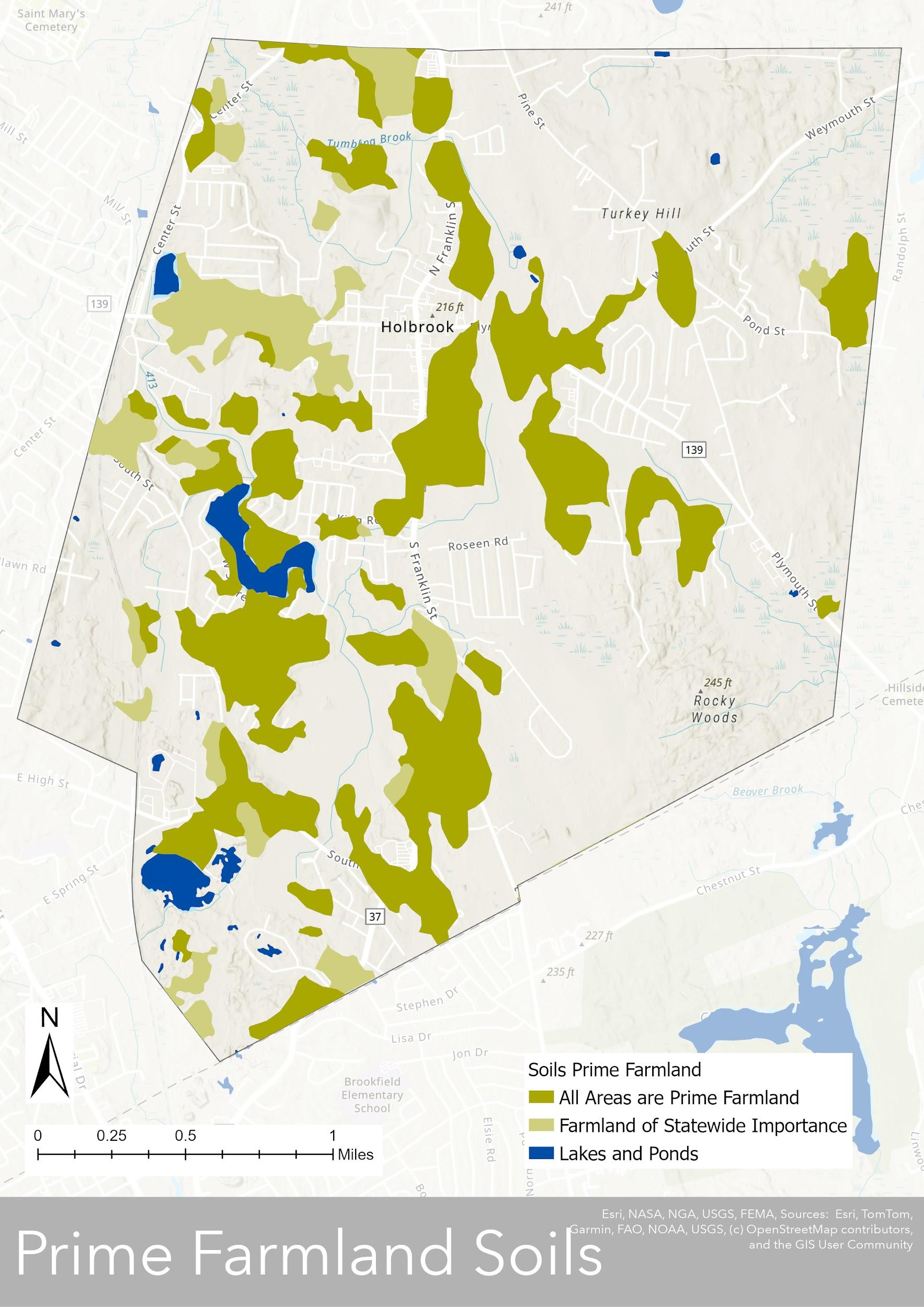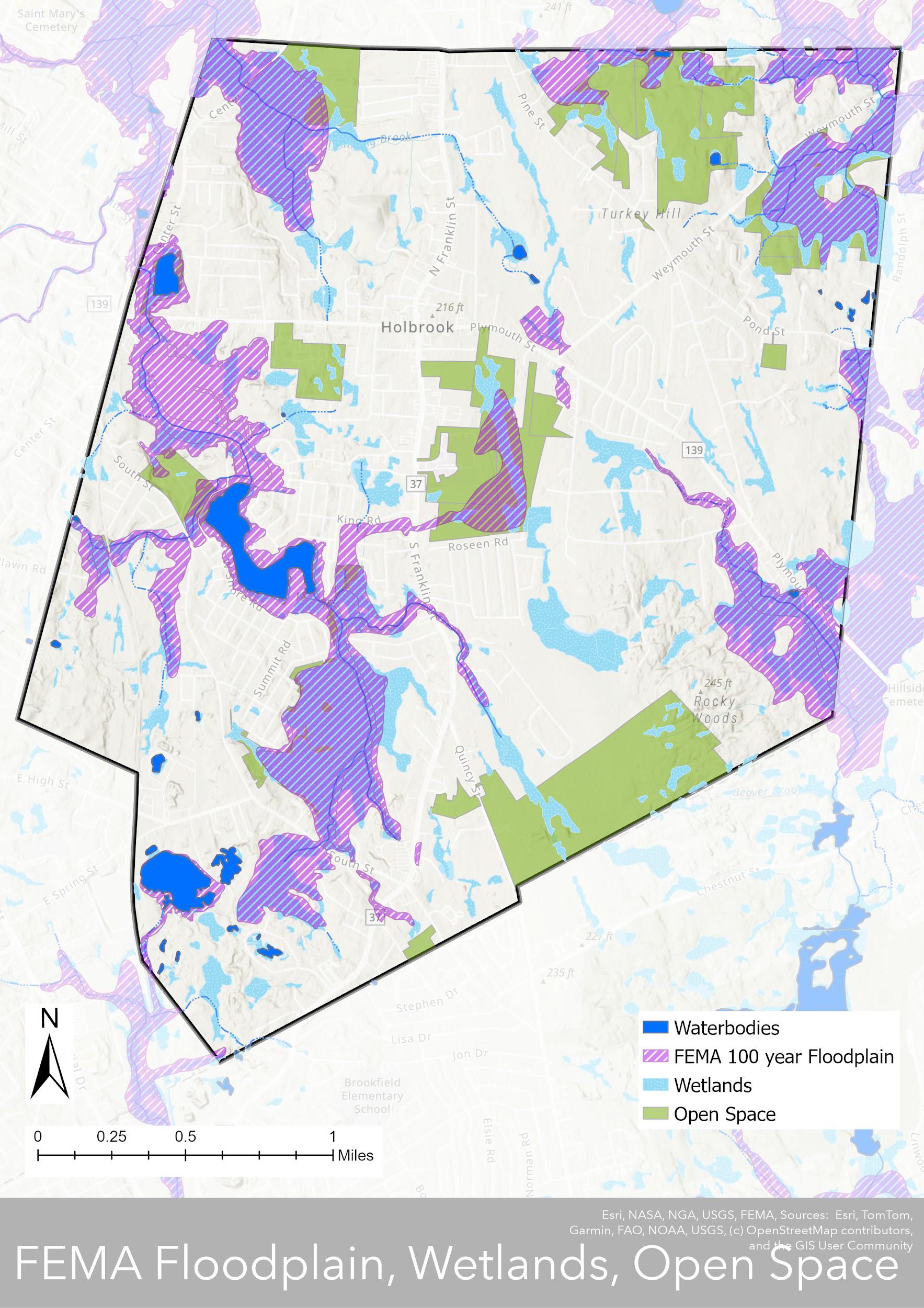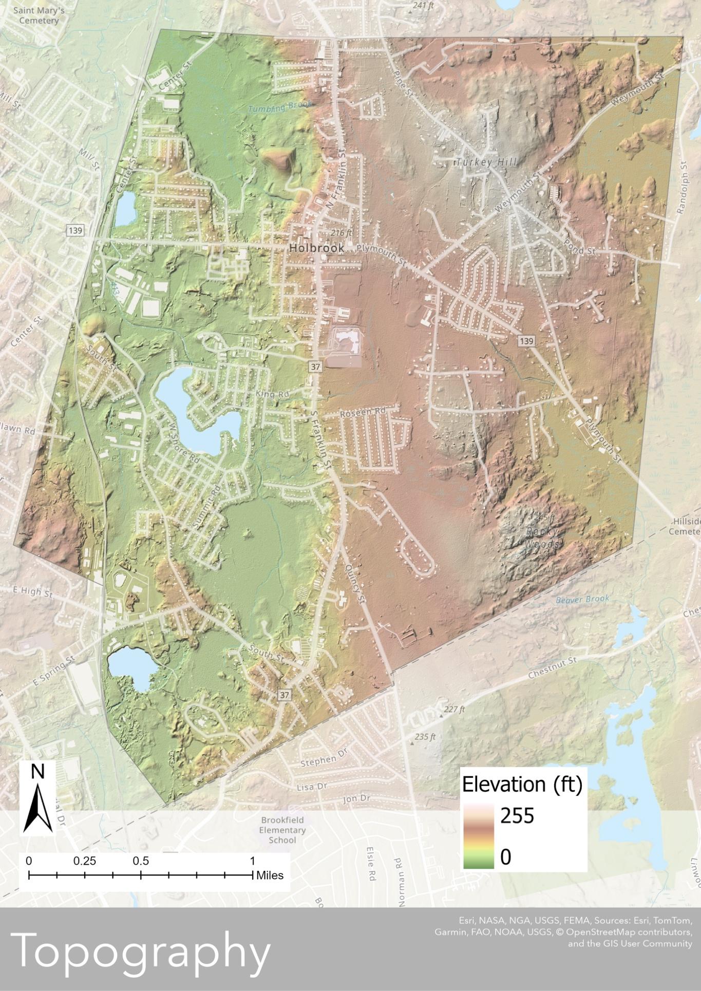 Holbrook’s physical landscape is shaped by its location within the Southern New England Coastal Plains and Hills Ecoregion, characterized by gently rolling terrain, glacial deposits, and a mix of upland and lowland areas (Map 3.1) Elevations range from 255 feet above sea level at Turkey Hill to approximately 100 feet around Lake Holbrook and Tumbling Brook (Map 3.2). The town’s topography, along with its history of glaciation, has led to a mix of sandy soils, wetlands, and rocky outcrops. These features influence land use and development, as low-lying areas with poor drainage and wetlands limit buildable space, while higher elevation areas with well-draining soils favor development. Additionally, the presence of wetlands and flood-prone areas requires careful planning to balance growth with environmental conservation and stormwater management.