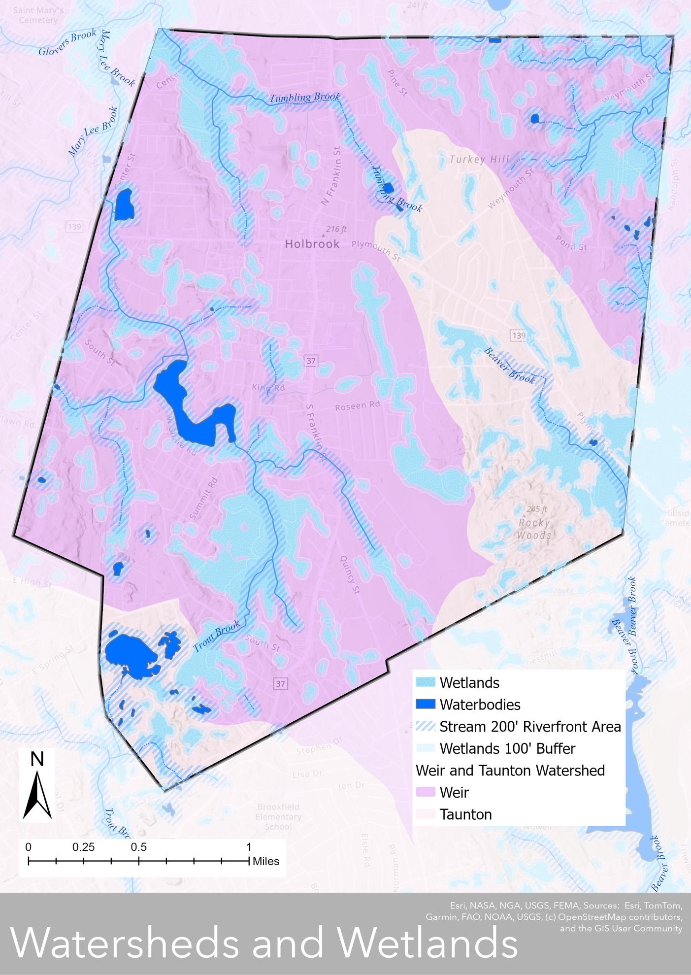 Holbrook falls within two watersheds, the Taunton and Weir River. The Taunton River watershed drains into Narragansett Bay, extending northward into town from the southern borders with Avon, Brockton, and Abington. Much of the town lies within the Weir River watershed and drains northward to Boston Harbor via the Cochato River and other smaller brooks (Map 3.3).