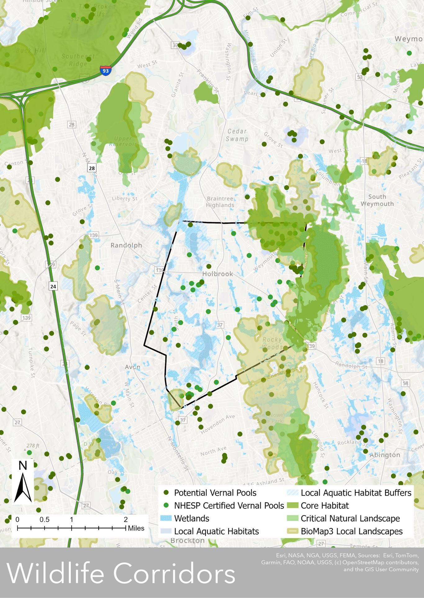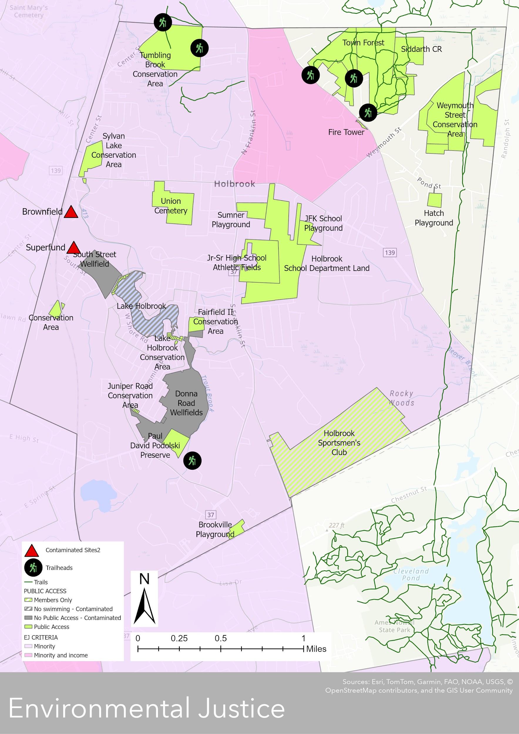 The following recommendations aim to enhance Holbrook’s open space and recreation resources, while priority should be given to connecting forest and natural areas to establish a network of walking trails both within Holbrook and extending into neighboring towns. Additionally, town-owned parcels with no protection and lands with limited protection should be reclassified to have permanent protection through Conservation Restrictions or Article 97, requiring a simple majority vote at Town Meeting. In the Environmental Justice areas, efforts should focus on improving shoreline amenities and creating new trails through existing conservation land (Donna Road Wellfields) and town-owned land (abutting Hamilton Way and Kane’s Pond). A design process exploring the configuration of a centralized community gathering space at the former JFK/school department site should be explored, with consideration of pedestrian connections to all parts of town. Existing outdoor athletic facilities, such as Sumner Field and Brookville Field, should be repaired and upgraded. Finally, all vernal pools in Holbrook should be protected from development and become NHESP certified pools.