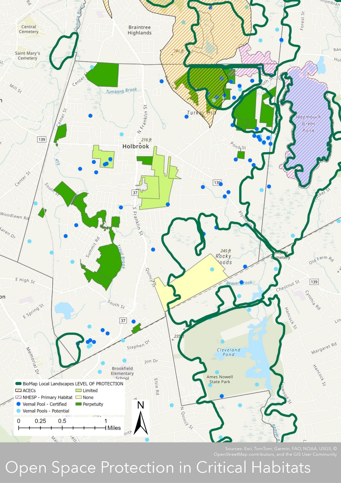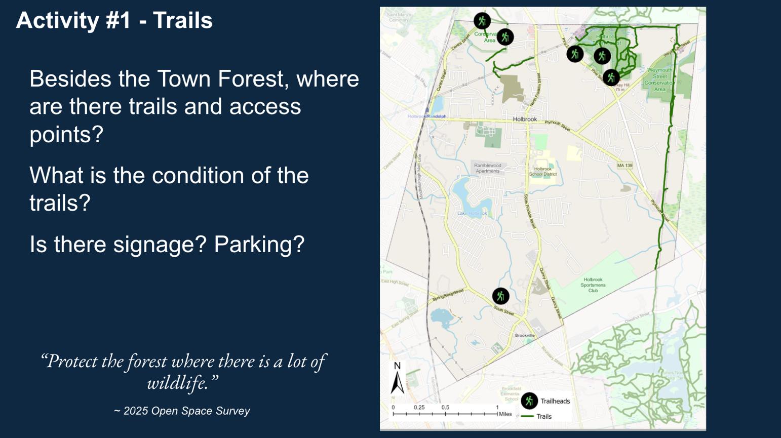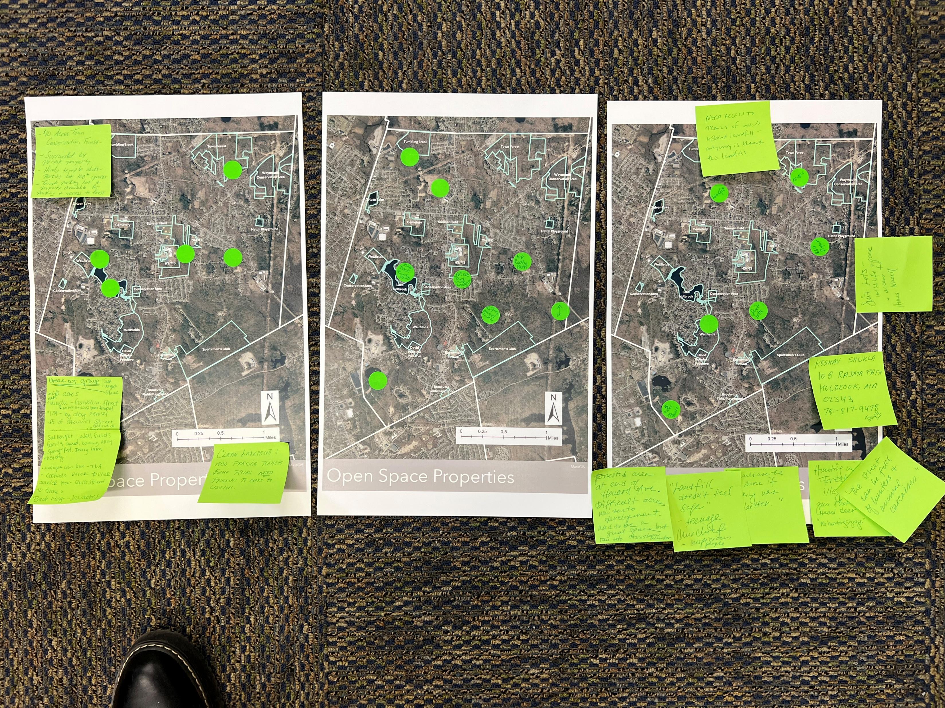 o Hand out Maps: Holbrook Open Space with levels of protection & ownership; Map of valuable habitat; Map of trails; Map of bodies of water