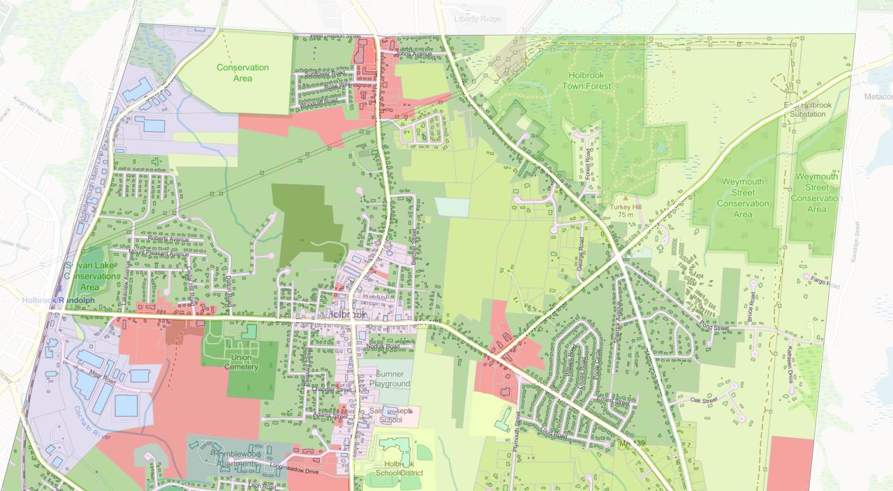 Holbrook is a mixed residential, industrial, and commercial community with a population of 11,320 (ACS 2023 5-year). Holbrook is a bedroom community, meaning many of its residents leave the town and commute into the city for work (most employment opportunities exist outside of Holbrook). Holbrook's proximity to urban areas makes it a desirable commuter community; both Boston and Providence are less than an hour away by car. Being a suburb outside of the Boston area, Holbrook’s development takes the form of primarily single-family dwellings. State highways include Route 37 running north to south through town, and Route 139 running east to west. These secondary roads (primarily two-lane roads) provide easy access to I-93, I-95, and I-90, located north and west of Town allowing for convenient access to Boston and the rest of the Northeast.