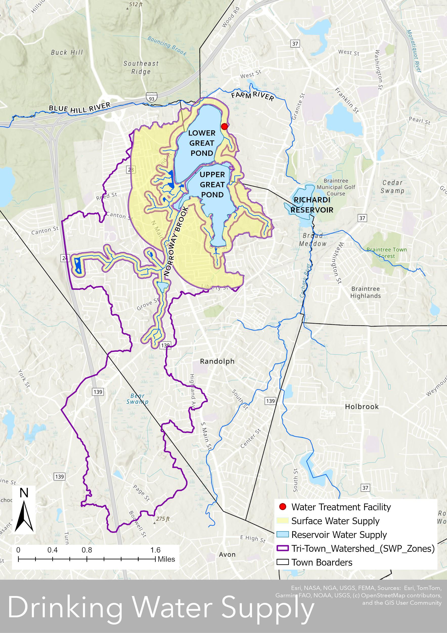 Great Pond is the public water supply source for the town of Weymouth and located just east of Holbrook’s eastern border. Due to the pond’s status as a source of public drinking water, active recreation is not permitted on the lake (no boating, swimming, or fishing). However, trails were recently added connecting Gifford Playground and Negus Park, providing an opportunity for passive recreational use.