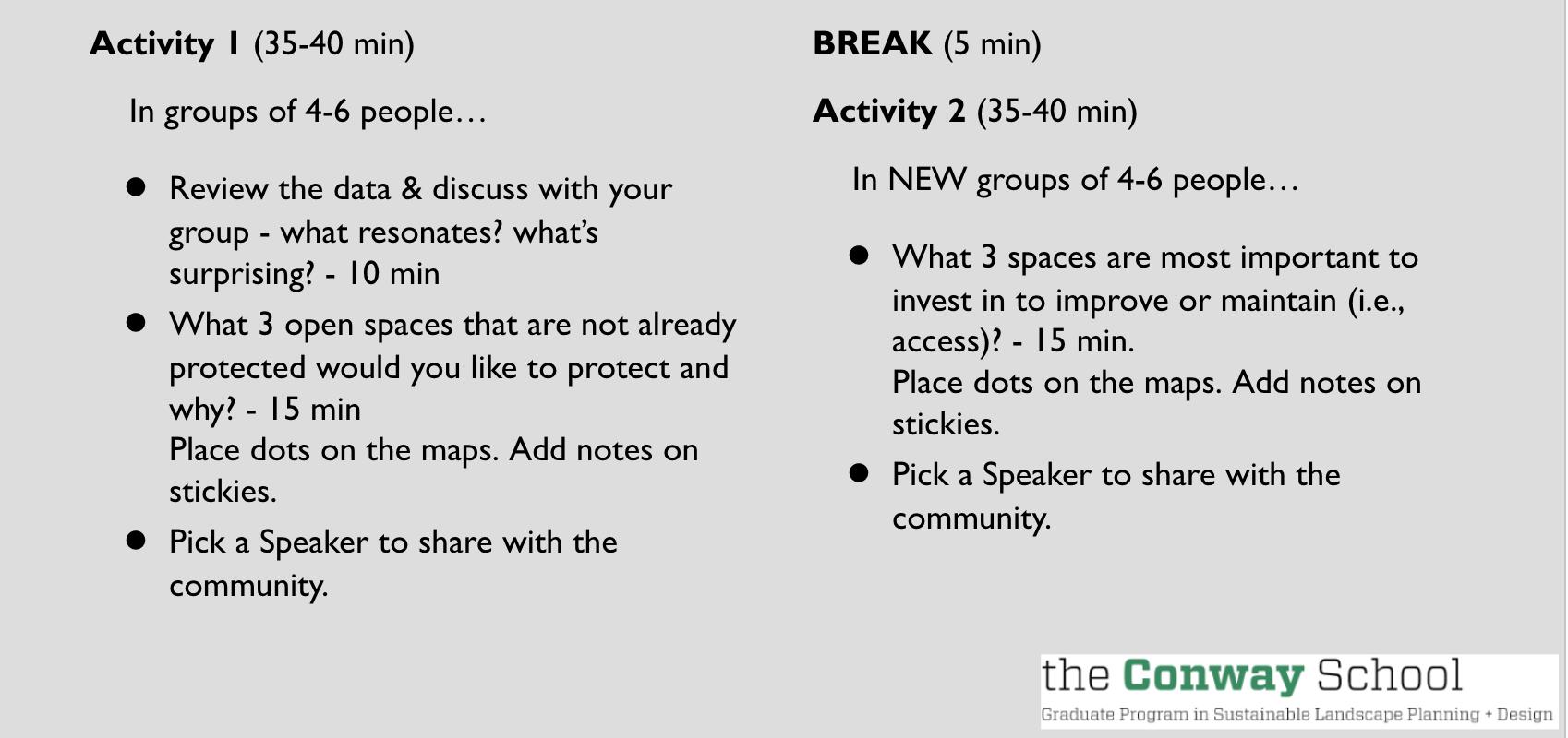 o Group Activity - Discuss and place dots on 11x17 map with top 5 spaces to protect - 15 min