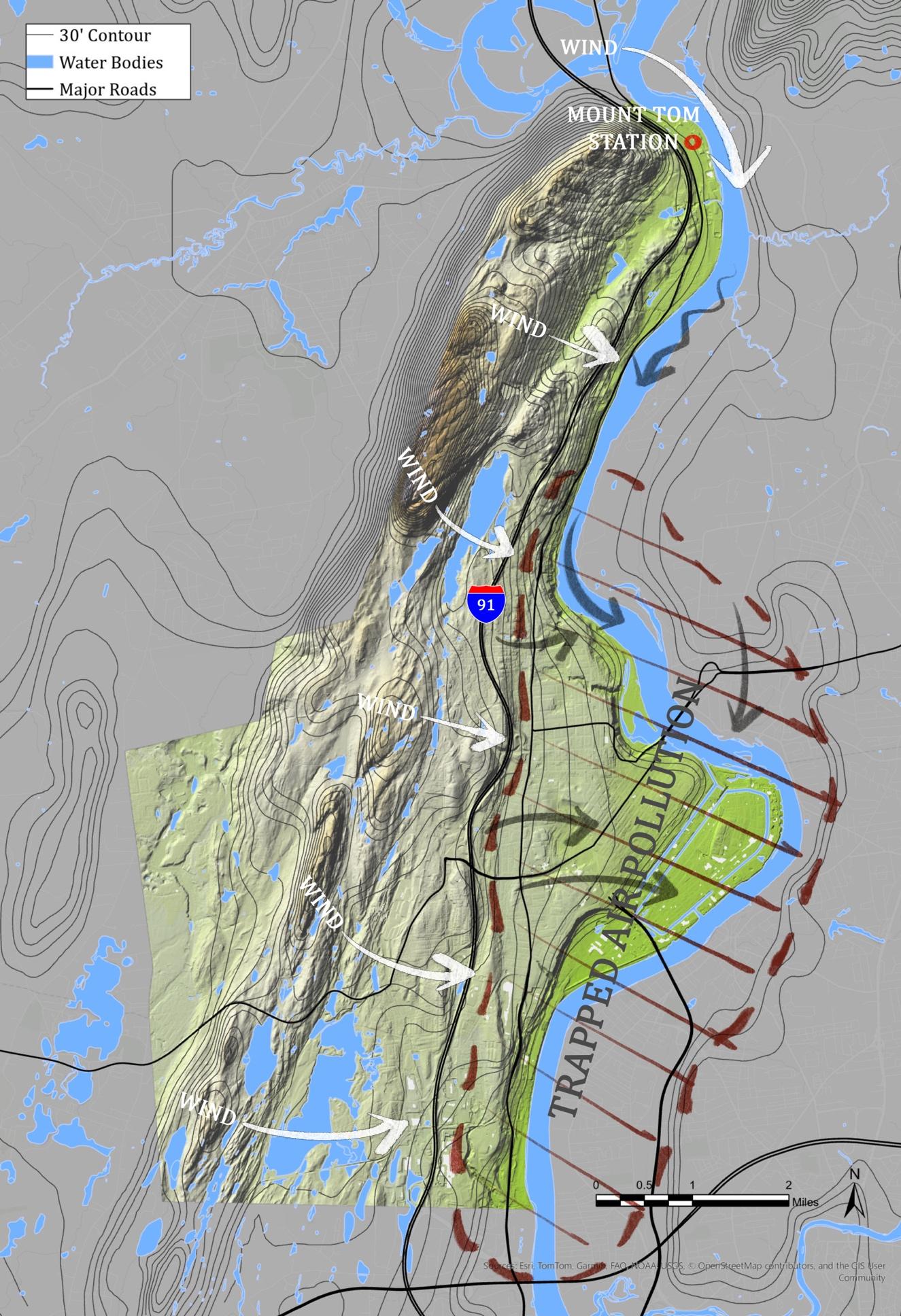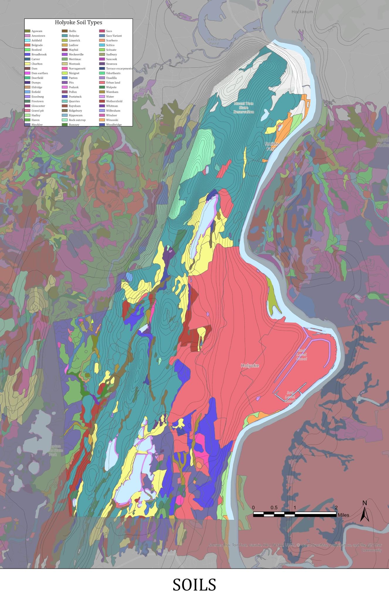 The Mount Tom-East Mountain range is a volcanic basalt formation that runs through Holyoke from southwest to northeast. A similar formation continues across the Connecticut River valley to the east as the Holyoke Range. These ranges are part of the larger Metacomet Ridge, which stretches from Long Island Sound to northern Massachusetts and marks the western boundary of the Berkshire Plateau. While some rural suburbs have developed on the plateau’s flatter terrain, west of the Mount Tom-East Mountain ridge, most of Holyoke’s growth has occurred east of the range, where the land slopes toward the Connecticut River.