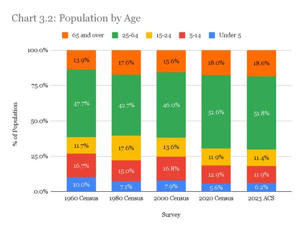 Holyoke’s population has been aging in the past few decades (see Chart 3.2). The median age has risen from 35 at the time of the 2018 OSRP to 39 years as of the 2023 American Community Survey (ACS). The percentage of residents under 25 years has declined from approximately 40% (between 1960–2000) to 30% in 2020, while the working-age group (25–64 years) increased from 42.7% in 1980 to 51.8% in 2023. The population over 65 has also grown.