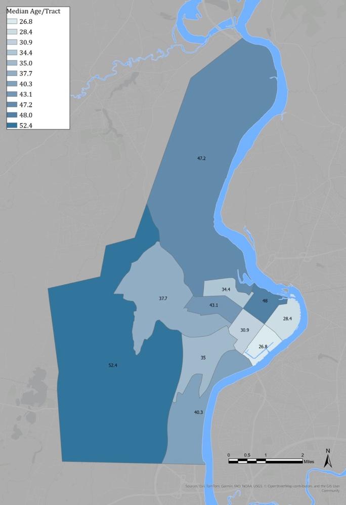 Despite the aging trend, downtown neighborhoods have a notably younger demographic, with a median age of 33.5 years. In contrast, areas north and west of downtown have a median age of 46, indicating an older population in the suburban areas around the city center and west of the Mt. Tom-East Mountain Range (See Map 2, via ACS data).