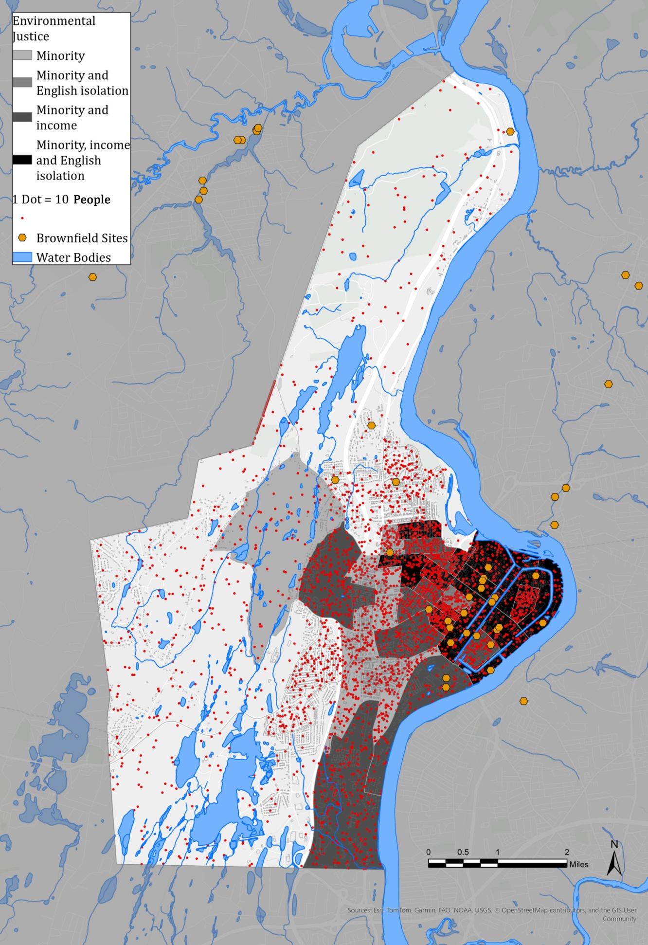 Approximately 24 percent of Holyoke’s land area, particularly in downtown and southeastern neighborhoods, qualifies as an Environmental Justice (EJ) community due to overlapping factors of race, language, and income (see Map 3). All three of the qualifying demographic factors of race, language, and income overlap in Wards 1, 2, and 4. The most dominant factors across this EJ zone are minority status and income limitations. It is worth noting that the bounds of the EJ zone closely resemble the bounds of the 1937 redlining map indicating that while redlining policies have been changed, structural change has yet to uplift these populations from deeply ingrained injustice, and more work is needed on this front.