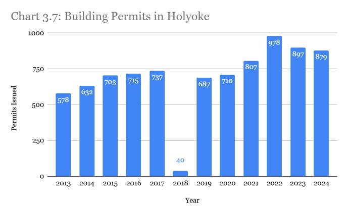 The American Community Survey reported that the unemployment rate in Holyoke has fallen from 8.6 percent in 2013 to 4.4 percent in 2023. This is an encouraging downward trend that is also nearing the state and national average (see Table 3.1).