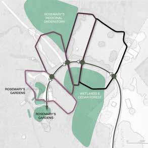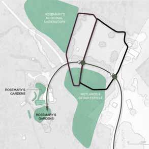 There are a number of existing gardens and structures that cannot be easily moved and are considered special to the Client. The gardens include Rosemary's formal medicinal and ornamental gardens, as well as forest gardens, where rare medicinals were planted beneath existing forest canopy. Dark-tone represents these special areas.