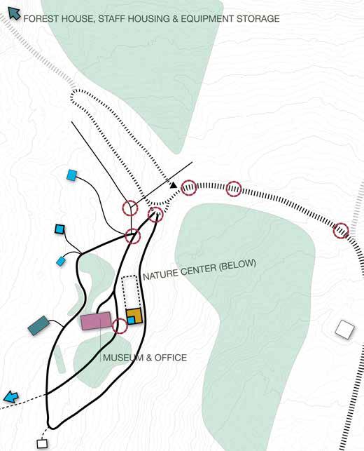 Vehicular entry proceeds along existing drive until it crosses the intermittent stream, at which point it turns right uphill to a turnaround and drop-off near the Nature Center, and long-term parking further up the hill. The former driveway to the Forest House is decommissioned, decompacted, and seeded to create a more robust stream buffer. Access to the Forest House is routed through the new parking area, stacking functions, and using the disturbance created by the power line clearing to further protect the stream.