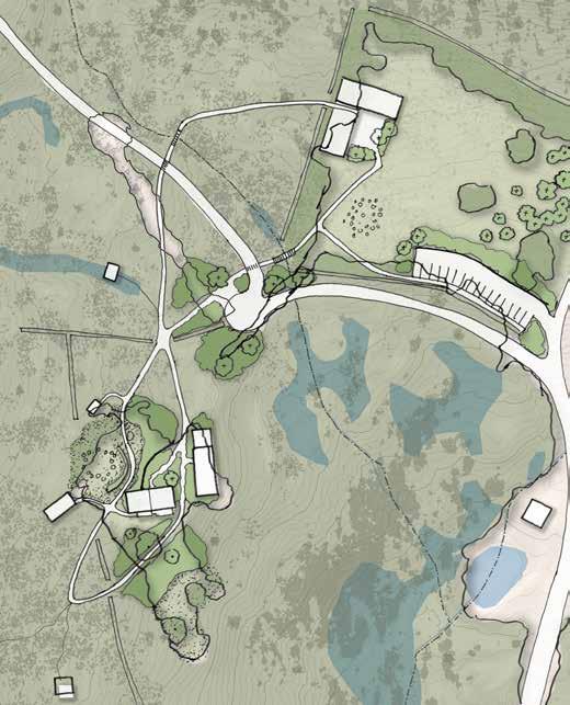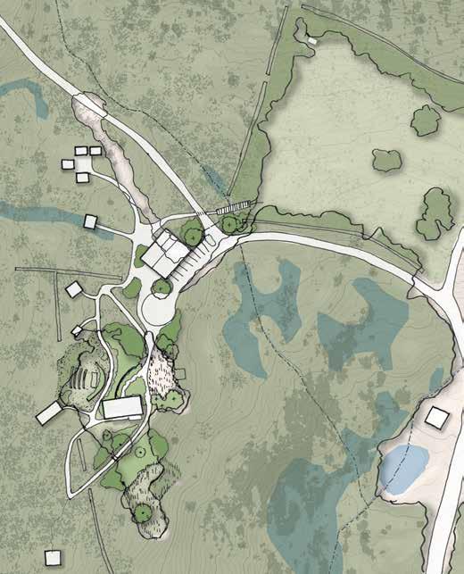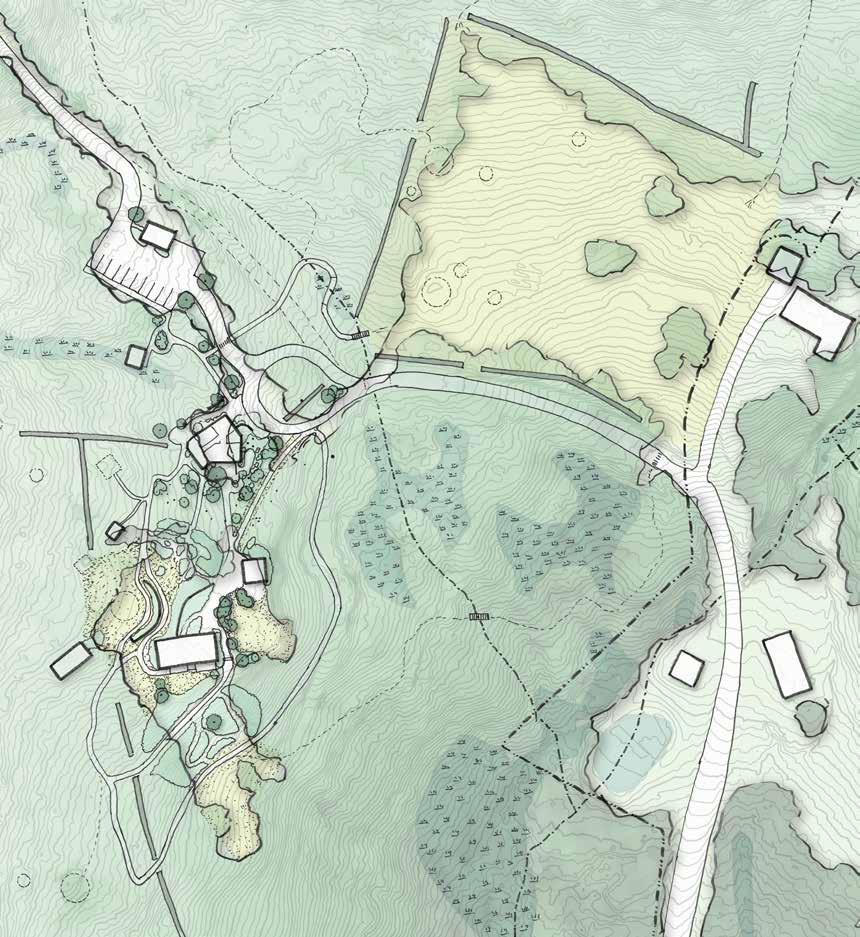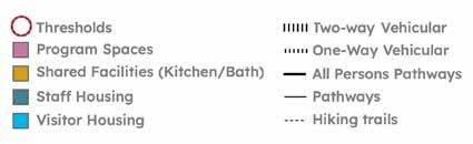The main driveway accommodates two-way traffic leading past the meadow and fen to a one-way loop just southwest of the intermittent stream. The one-way loop is designed to simplify passage and navigation for various users and residents. Youth arriving by bus and other visitors requiring drop-off travel all the way around the loop to a designated drop-off in front of the Nature Center. Visitors arriving by car follow the main drive seamlessly up to the parking area where all parking spots abut an accessible pathway connected to the All-persons loop. This loop is consistently +4' wide and made of TRG gravel, providing access to people of all abilities to experience Sage Mountain. The loop runs from The Nature Center, into the inner core, through Rosemary's lower and upper gardens, past lodging and shared facilities back to the Nature Center. Vehicular access is limited to the northern part of the focus area and the inner core is transformed into a pedestrian space. Emergency vehicle access is planned for in the materiality and dimensions of the main path leading to the inner core. The original driveway leading to the Forest House has been decommissioned to allow for a larger stream buffer zone. Residents of the Forest House or organization vehicles traveling to the workshop in the parking lot, use the same driveway as all visitors but follow the road up past the workshop to meet the remaining existing driveway.