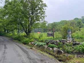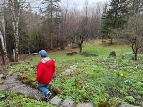 The main drive pulls into a maple lined alle. To the north is the site's largest open space, 'The Meadow' (photo 1) where much of the organizations youth programming occurs. To the south, a calcerous fen (photo 2) not currently traversed by visitors but in the past had boardwalk access into. The driveway bends to the south and crosses over an intermittent stream (photo 3) right before another driveway leading to housing in the northwest becomes visible. This drive runs alongside an area which was recently disturbed to place power line poles (photo 4). Parking that accommodates four cars sits northwest of the campus core (photo 5). The core consists of two small guest cabins; an auxillary building which houses the office, garage and communal kitchen and library; as well as the main house (photo 6). Rosemary's gardens are partially in this core and partially behind the main house (photo 7). Two yurts exist on site for the purposes of youth program indoor space (photo 8) and storage.