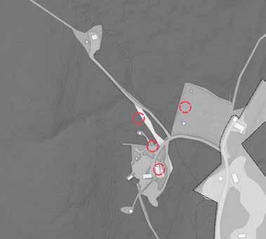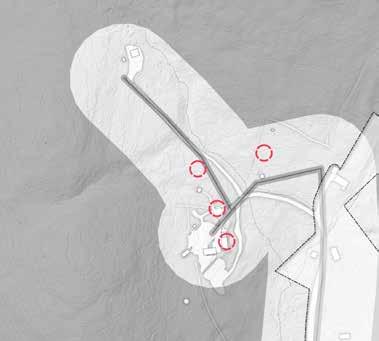 Water accumulates in wetlands just downhill from most programmatic elements to the southeast of the main driveway. Some elements, such as the main driveway, Forest House driveway, and the grading below the office, are within the wetlands and stream buffers. According to the Vermont DEC and Agency of Natural Resources, wetlands buffers of 50' are applicable. Stream buffers are at least 50'; however, 100' may be applicable and should be confirmed with state agencies prior to construction. Dark-tone represents the actual hydrological feature, and mid-tones represent 50-foot buffer, as well as possible 100-foot buffers for the stream.