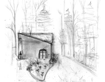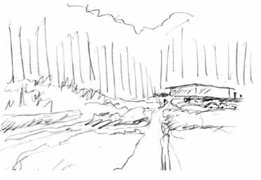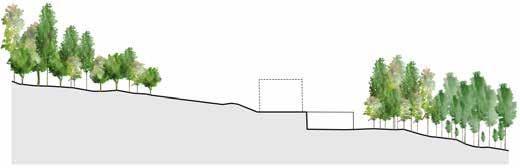 A 20x30 square foot workshop and garage has been sited within the parking area for proximity to the forest house, upslope location from the rest of programmed site, and to move it from its existing location in the inner core. Overflow parking is located next to this building to the east.
