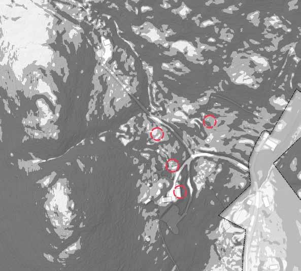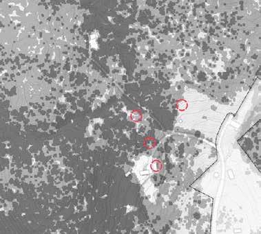 The areas that are the darkest have the most constraints, and the areas that are light are the most suitable for development based on these parameters. The initial design criteria provided by the Client for the Nature Center was a 4,000 square foot building area. To illustrate this, a 4,000 square foot circle placed on the lightest areas. These areas were then further reduced to four of the best spots based on discussion with the Client and additional factors, such as ease of access, location relative to neighbors, and distance from the core.