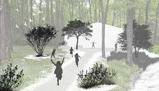 THE DESIGN LOCATES THE NATURE CENTER CENTRALLY ON THE SITE, WITH A VIEW OF ALL MAJOR PROGRAMMATIC ELEMENTS & REVERED SPACES. NESTLED IN A GROVE OF SUGAR MAPLES, THE NATURE CENTER WELCOMES GUESTS ARRIVING FROM THE PARKING AREA AND DROP OFF. THE NATURE CENTER'S INDOOR SPACE SPILLS OUT INTO A SERIES OF OUTDOOR EDUCATION SPACES.