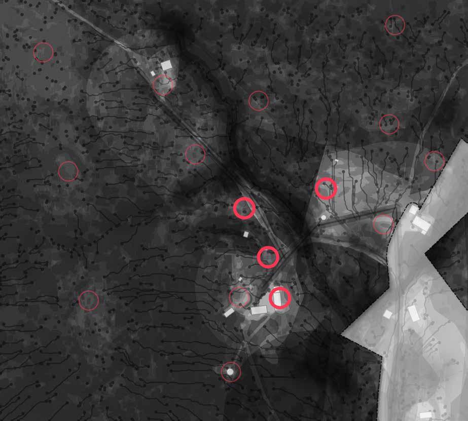 GIS analysis shows micro hydrological channels and junctions (represented by the dark lines), and the darker heat map shades of junctions are correlated to wet spots on site. The siting of the main programmatic elements, such as housing, the Nature Center, and parking, should avoid areas where water is channelizing to avoid moisture issues.