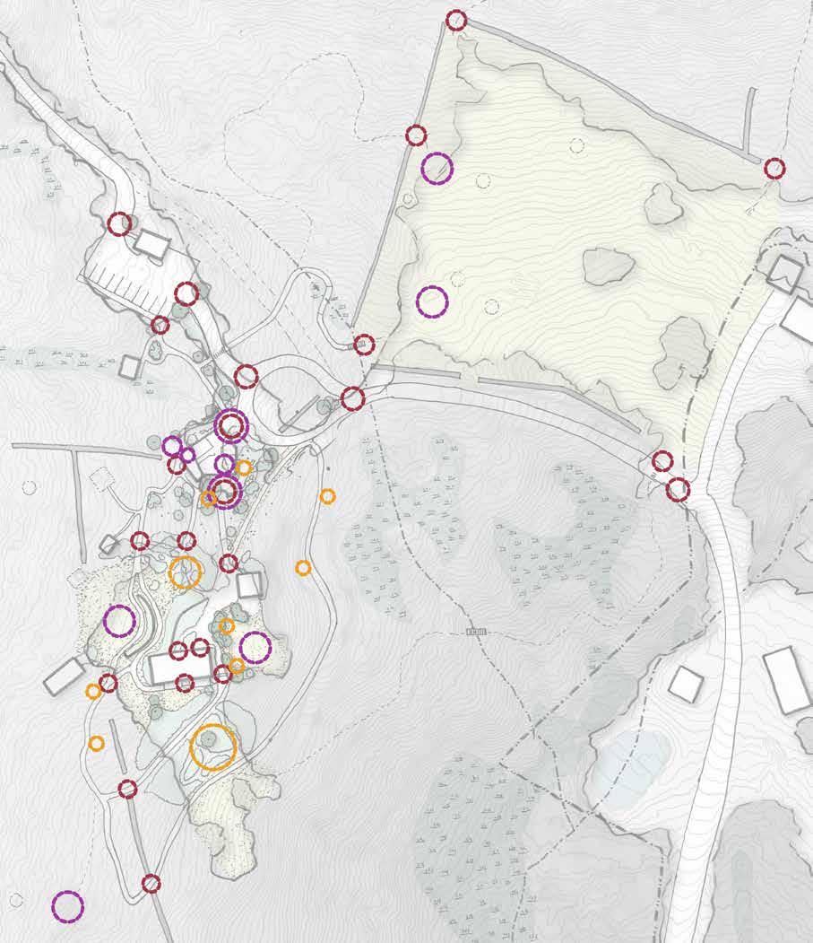 Throughout the site, there are 'housing expansion area' (HEAs) which can serve as evolutionary and adaptive housing. Such sites could remain camp sites for guests, be expanded to include a tent platform, or could be built into three- or fourseason tiny homes. These potential new sites, as well as existing tiny homes, would primarily use the diverse shared kitchen and bathroom infrastructure, but could also be outfitted with compost toilets within or just outside the housing, for more convenience