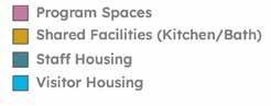 • One staff housing unit with office. Kitchen and dining space could remain communal to staff or both staff & guests.
