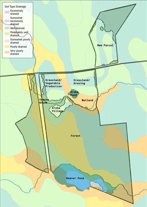 Slopes of greater than 30% are observed south of the animal barn, around the proposed road crossing, and along the banks of the western portion of the Grassy Brook as it runs through the site. Slopes level out to the west and north of the hoop houses, around and below Kroka Pond, and in the western portion of the Village and in the forest. This steep topography creates conditions where water moves fast over some areas and slow over others. In the steep areas, some erosion has been observed, and measures should be taken to ensure these slopes are stabilized.