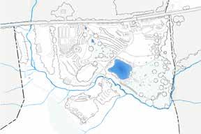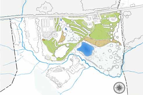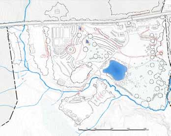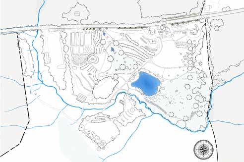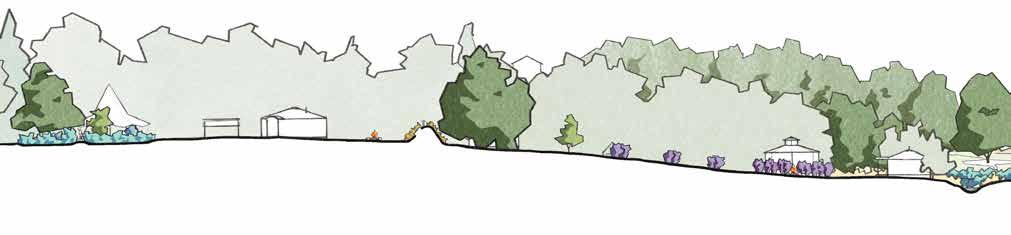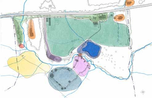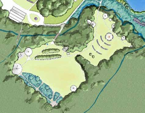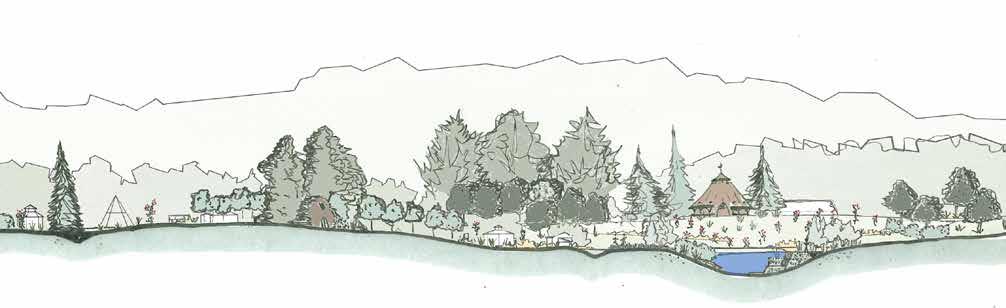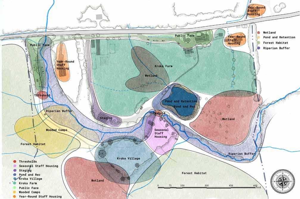 Kroka Village has six new features, apart from the woodland wetland, mentioned above. A line of trees separates the staff and basecamp areas of the village, embracing each space allowing both to serve their unique functions. This line of trees also serves as the refuge to locate the new earthen structures. The Staff Village replaces the diseased blueberries with honeyberries that frame a staff circle. The bridge from the Staff Village is reduced in size and priority, and the riparian area is planted with a new bank of trees, woody shrubs, and herbaceous groundcover. Not shown in this section is the new bridge to access the village further northwest.