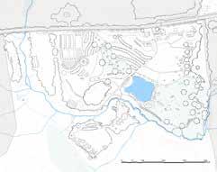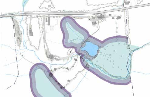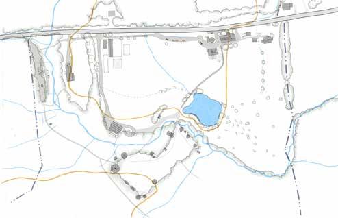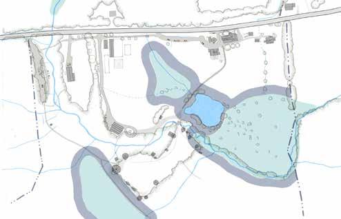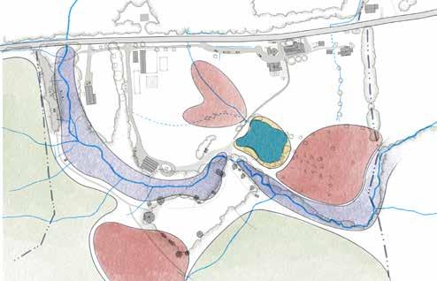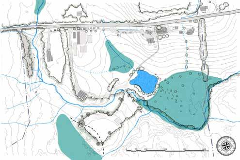 Yellow lines in the map to the right, also highlighted in the small map, bottom left, delineate micro-basins that determine where surface water runs on site. The larger the basin, the more water accumulates. The steeper the basin, the quicker it accumulates. The undulating topography throughout the focus area creates three primary micro-basins: the flat woodland zone to the west of the Village, Kroka Pond, and the Grassy Brook. The Grassy Brook is the largest basin on site, but also, given its nature, moves water the fastest. Kroka Pond and the woodland zone receive water runoff from sloped areas but store it in their respective basins, slowing water enough for it to infiltrate. This highlights the large retention capacity for water throughout the site and begins to explain the wet conditions observed in the western portion of Kroka Village.