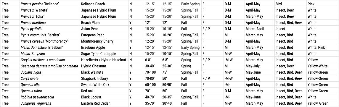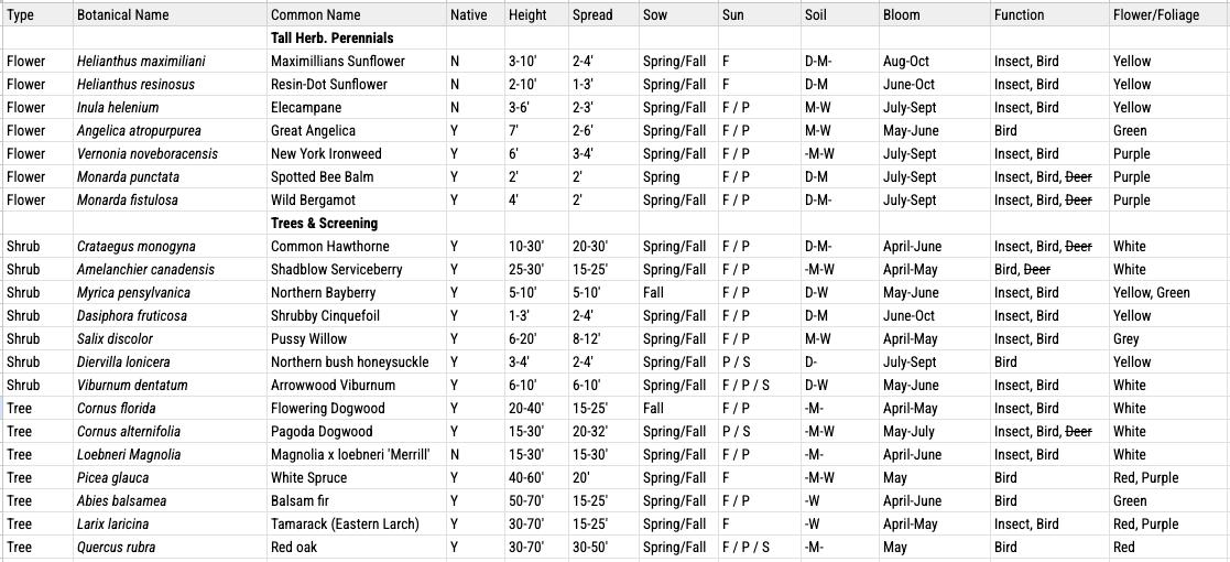 The plants in this palette are intended to be planted along the street and paths at Kroka. Along the southern edge of Route 123, hawthorne and crabapples can be planted with an understory of herbaceous perennials that die back each season. These plantings will provide a visual barrier to the road from Kroka and will also reduce the amount of mown lawn on campus.
