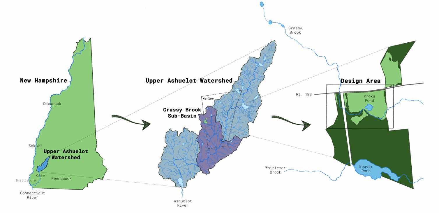 "Ashuelot" is an Abenaki word which means the "place between" or "collection of many waters." The Ashuelot River basin encompasses approximately 415 square miles. The site sits within the upper Ashuelot watershed, towards the top of the Grassy Brook sub-basin. The Grassy Brook flows for approximately 0.8 miles from its source through six other forested parcels before entering the Kroka site through a culvert under Route 123. The Whittemer Brook flows approximately 0.4 miles from its source at the top of the watershed before entering the Kroka site, eventually meeting the Grassy Brook 0.6 miles downstream. The Grassy Brook encounters no man-made dams before flowing into the Ashuelot River at the bottom of the valley.