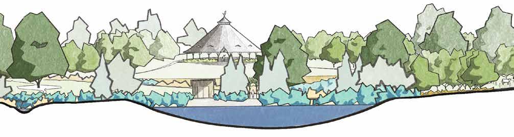 This phase imagines a future where resilient infrastructure and healthy ecosystems meet the next evolution of Kroka. The orchard is in full bloom. Paths draw community members in every direction. Maturing vegetation creates intimate and expansive outdoor spaces, and a new farm energy center emerges, drawing campers and community members to broadened programming and events.