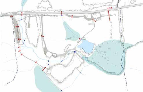 Arrows show the expected direction of runoff from micro-basin divisions, shown in yellow. Water moves through the swales and ditches and accumulates in Kroka Pond. Water also moves through the forest to accumulate in the woodland zone west of the Village. Following the drainage patterns of these two basins, it is observed that water eventually drains from them into the Grassy Brook basin. In Kroka Pond this happens via the man-made overflow in the northeast corner of the pond. The woodland zone is drained via streams north and south of Kroka Village. This gradual drainage slows the speed at which water enters the Grassy Brook, helping to ease stormwater inundation of the brook and regulate flood waters downstream. In large rain events, however, the steep slopes prevalent throughout the site and channelization of the Grassy Brook contribute to flooding conditions in the Grassy Brook and Kroka Pond, disrupting campus activities, sweeping away bridges, and limiting access between the administrative area and Kroka Village.