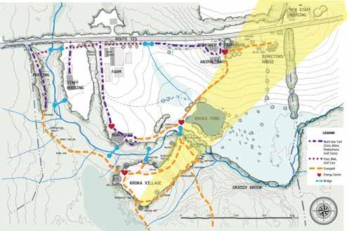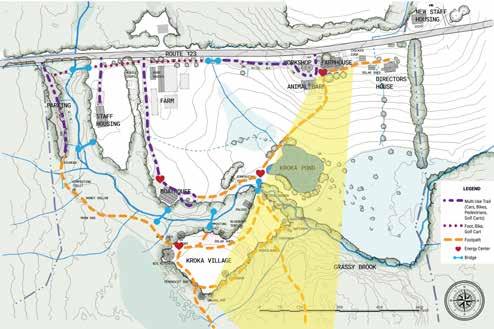 A lot of Kroka's community uses bikes and golf carts to circulate around camp. The multi-use paths (for pedestrian, bicycle, vehicles and golf carts) are concentrated to the northern part of the campus, towards Route 123. The southern part of the campus is a network of trails that are utilized by walkers and bicyclists. There is a loop trail around Kroka Village, as well as bridges that lead over the Grassy Brook to trail networks between the western staff house to behind the composting toilet in Kroka Village. There is little to no activity or circulation in the spaces between the Boathouse road and the boardwalk. There is also no summer circulation east of Kroka Pond or south of the Directors' House. This area is considered notably under-utilized from Kroka's perspective.