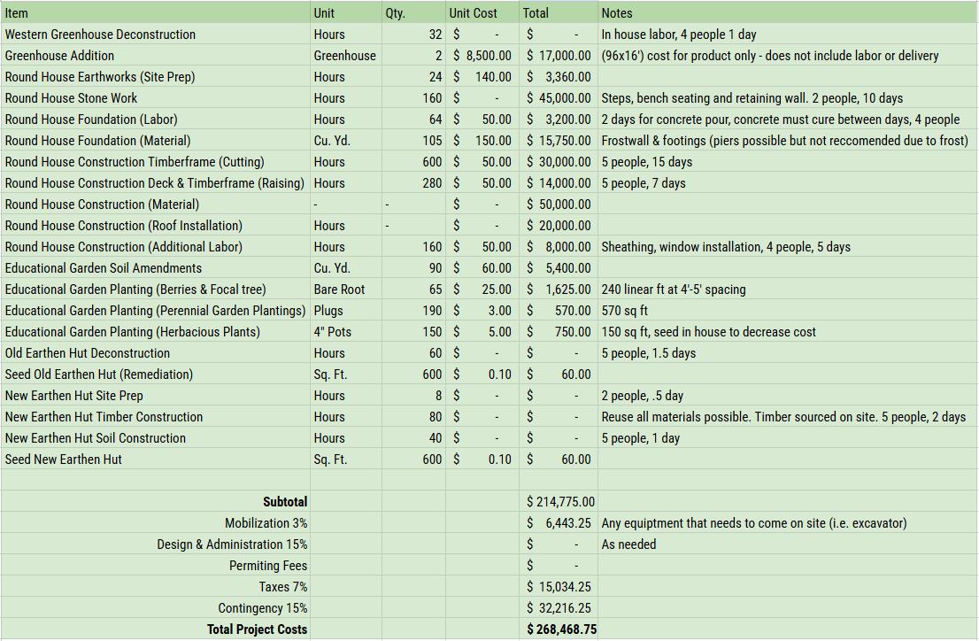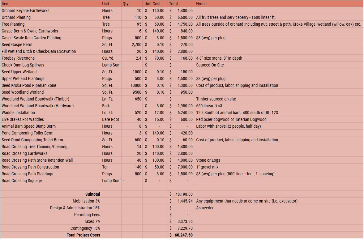 Trees and plugs prepare Kroka for future growth, intentionally planted into a landscape prepared to accommodate a new farm energy center, established crisscrossing trails, and outdoor classrooms. Estimates consider hydraulic interventions along with opportunities for staff and camp involvement.