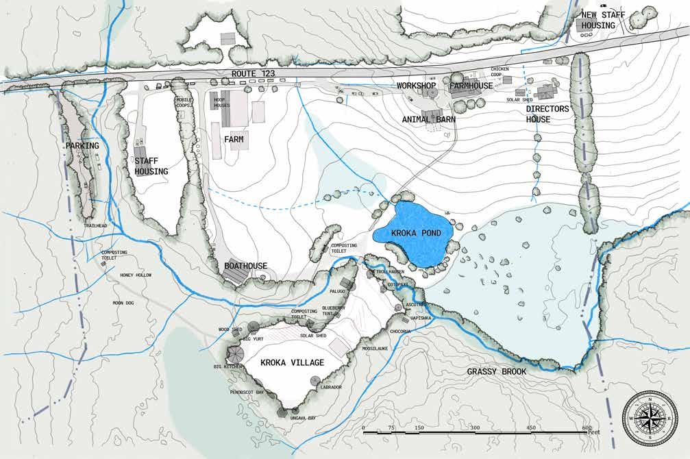 The southwestern edge of Kroka Village backs up to a wetland and creates a very wet topography in the areas by the Big Bitchen and Teepee, the two earthen structures and kitchen, which combined create the Penobscot Bay base camp. The recently constructed Ungava bay structures were built to replace another two earthen structures which had run the course of their lives. The siting of any structures through design alternatives will be considerate of the 50-100 foot wetland buffer in any given zones surrounding these areas.