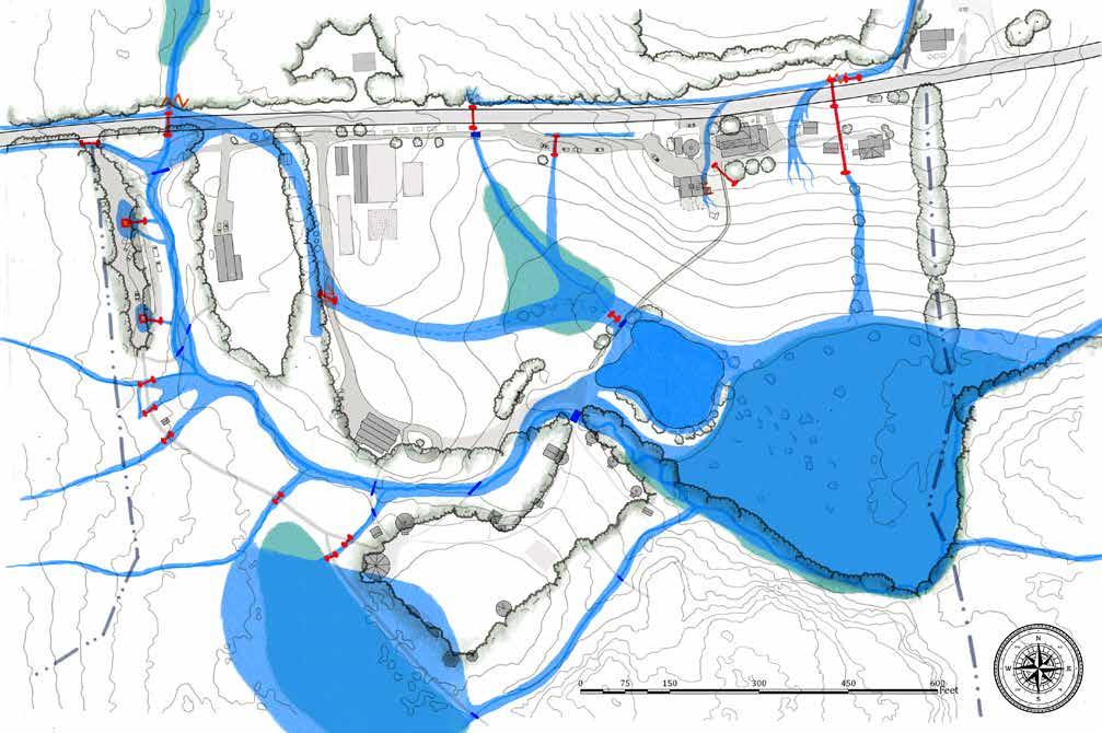 The new bridge to access Kroka Village is created with bouldering and earthworks which raises the bridge 4 feet off of the brook, accounting for any flood events, while providing a grading scheme that allows for tractor access.