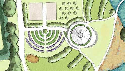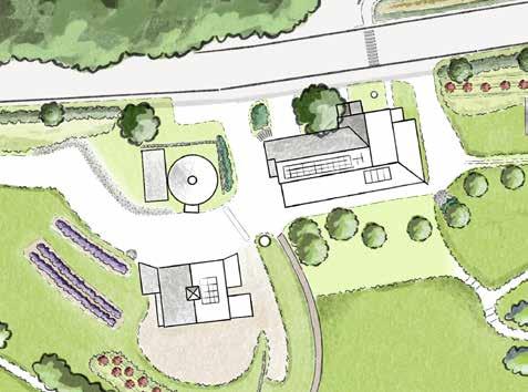 The energy center is situated southeast of the annual production beds and is composed of a large educational garden, a timber-framed round house for events and farm programming, an open lawn, and a composting toilet to the north (out of the focus frame). The round house can be accessed by new trail networks from the farmhouse, and accessible paths from the northern multi-use path, the Boathouse access road, and the Boathouse itself. The structure is framed by rows of fruiting trees and opens up to expansive views of the campus to the iconic Farmhouse and Barn, Kroka pond, and Boathouse.