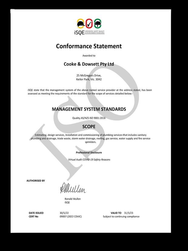 Cooke & Dowsett Plumbing Groups confidence in our ability to deliver industry-leading projects is founded on the design and implementation of our Quality Management System that details a clearly defined set of principles, processes and strategic goals that foster continuous improvement across all levels of the organisation.