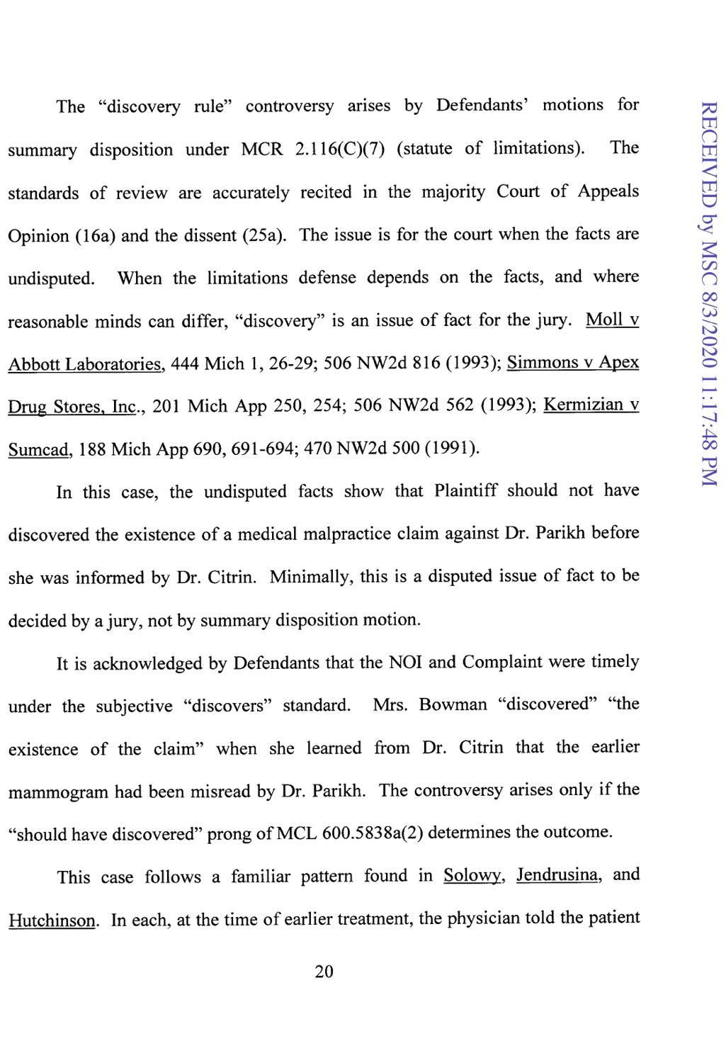 On appeal, the Supreme Court reversed the summary disposition which had been awarded to Defendants. The Court concluded that where the facts do not compel the patient to infer malpractice, but arise suspicion, courts should consider diligence by the Plaintiff in the statute of limitations analysis. On that basis, the Supreme Court reversed the summary disposition and remanded for further proceedings.