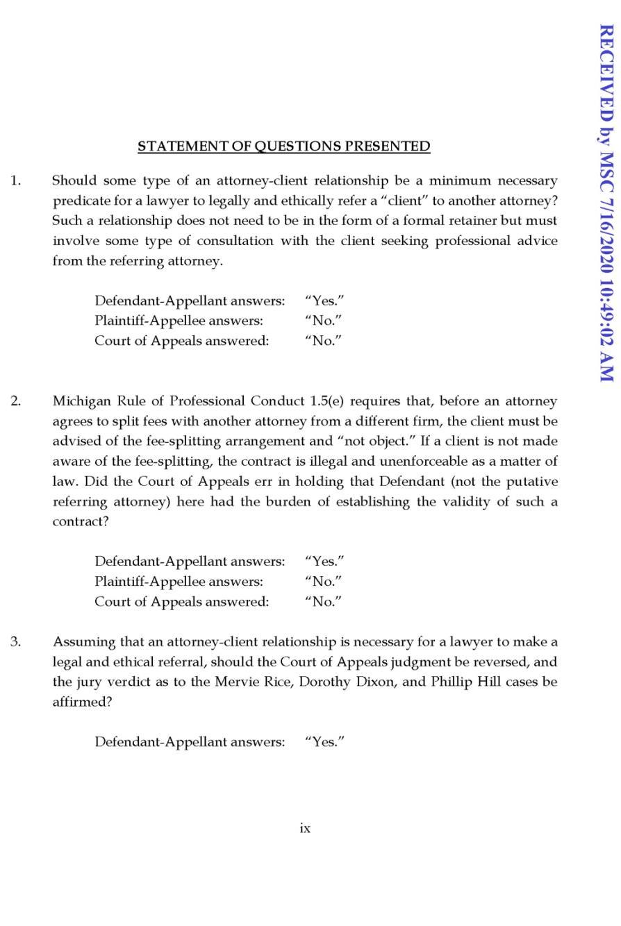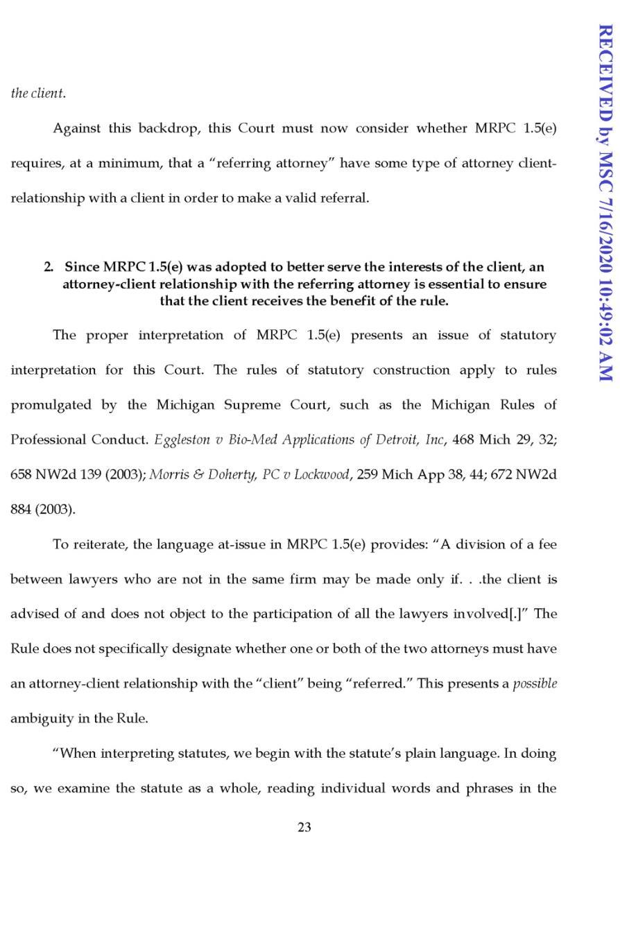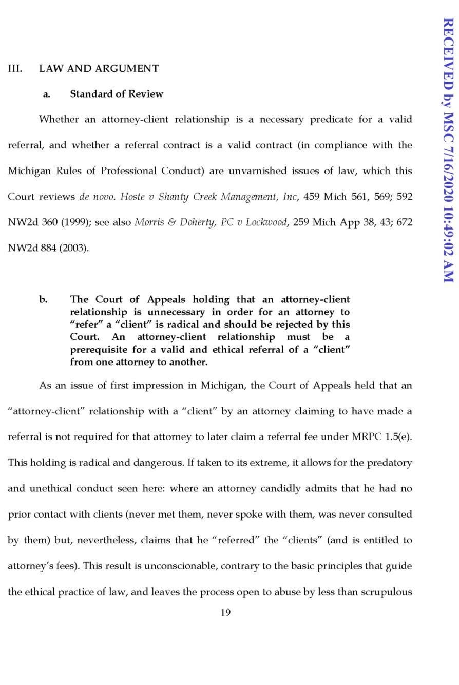 Defendant Appellant’s brief argued that the Michigan Court of Appeals cleared a pathway for predatory practices when it held that an attorney client relationship is not a necessary prerequisite for a lawyer to claim an attorney fee for legally and ethically referring a client under MRPC 1.5(e). Defendant Appellant’s brief also addressed the order for a new trial. Citing a consensus of cases on this matter, Defendant Appellant encouraged the Court to find that there was no basis for the Court of Appeals to order a new trial. The brief pointed out that because an attorney client relationship is required, the trial court did not err in instructing the jury that such a