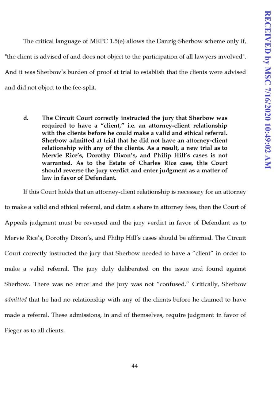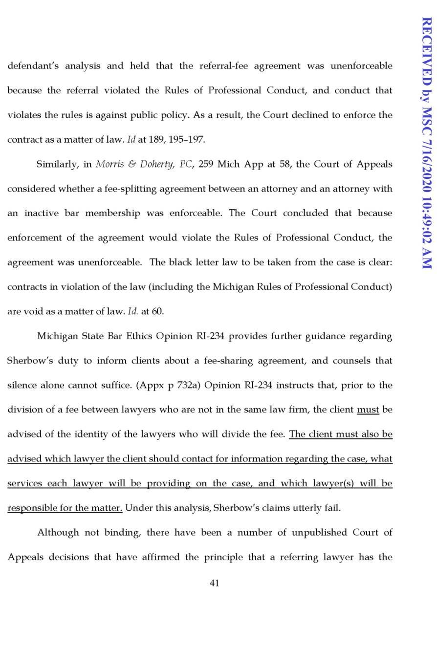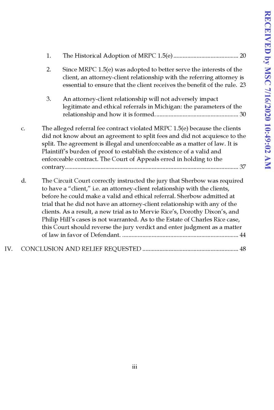 Defendant Appellant’s brief argued that the Michigan Court of Appeals cleared a pathway for predatory practices when it held that an attorney client relationship is not a necessary prerequisite for a lawyer to claim an attorney fee for legally and ethically referring a client under MRPC 1.5(e). Defendant Appellant’s brief also addressed the order for a new trial. Citing a consensus of cases on this matter, Defendant Appellant encouraged the Court to find that there was no basis for the Court of Appeals to order a new trial. The brief pointed out that because an attorney client relationship is required, the trial court did not err in instructing the jury that such a