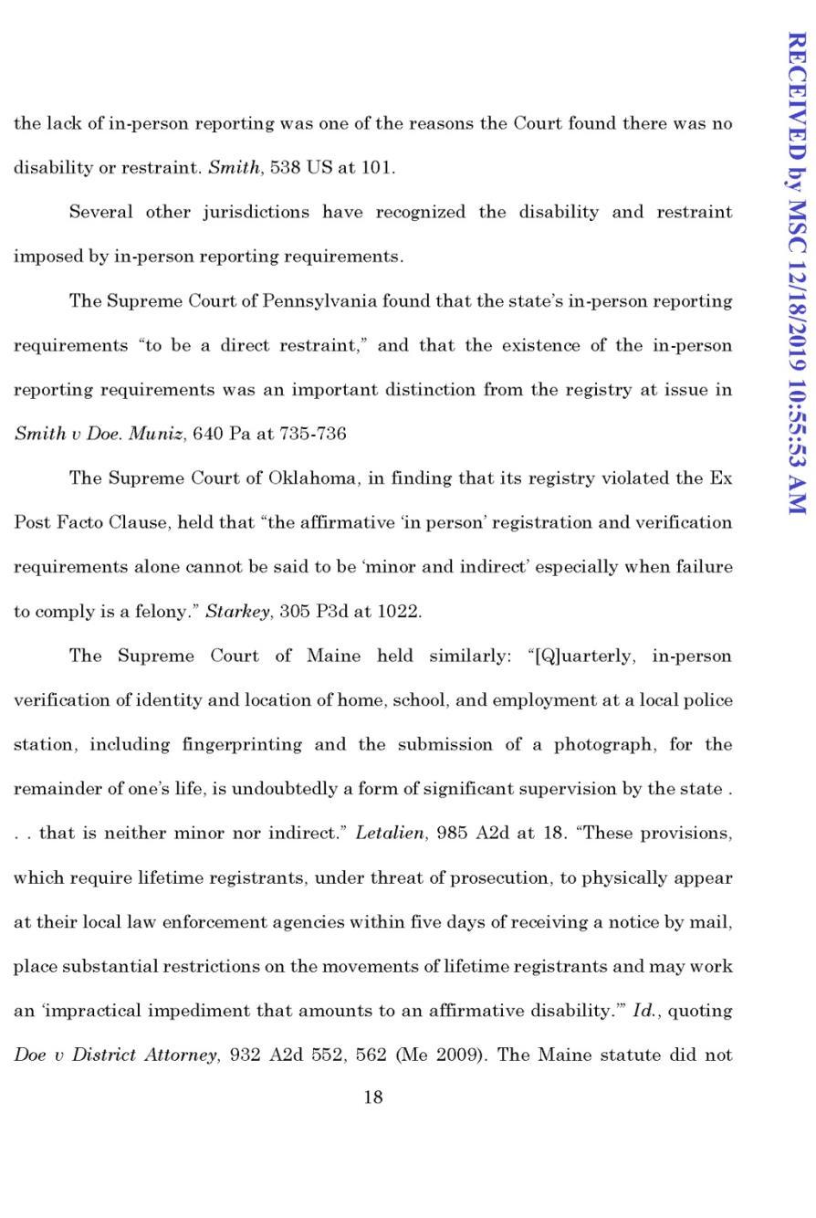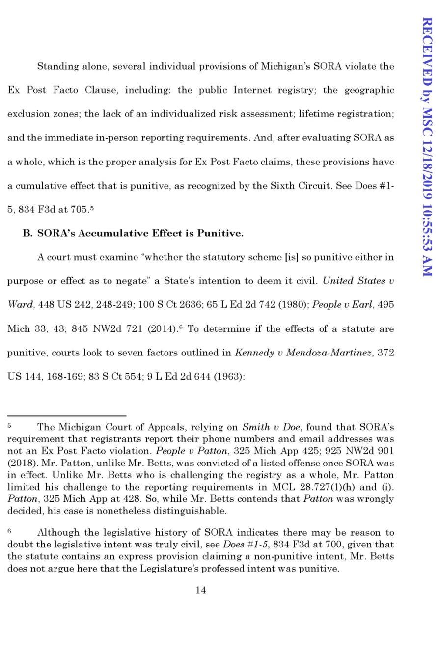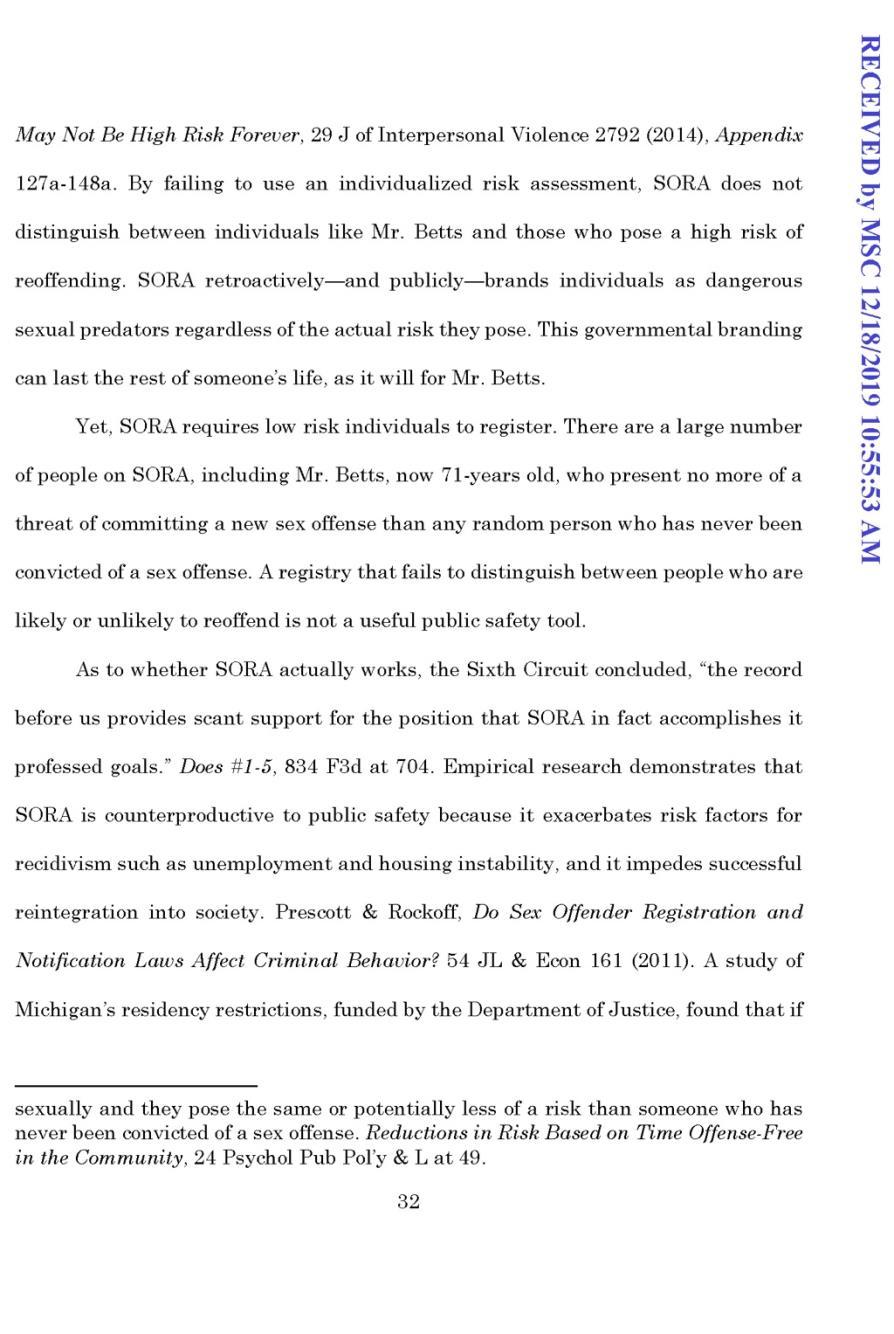 The issue in People v Betts was whether the 2011 Sex Offenders Registration Act was unconstitutional, ex post facto punishment. In July 2021, the Michigan Supreme Court held that it was. The decision capped off nine years of litigation, which first began with Mr. Betts’s pro per motion in the trial court. The Court specifically noted the following portions of the 2011 SORA that supported its conclusion that registration was punishment, and unconstitutional when imposed retroactively: it restricts where registrants can live, work, and loiter; it is comparable to shaming, given the public internet registry and the vast amount of information made public just by registration; it resembles parole, given the “significant amount of supervision by the state”; it imposes onerous burdens such as immediate in person reporting requirements based on numerous and often mundane life events; it is excessive given the “uncertainty of the 2011 SORA’s efficacy” in reducing recidivism, due to the lack of an individualized assessment of risk. All of SORA’s punitive burdens were discussed extensively in this brief.