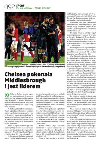 Piłkarze Chelsea Londyn wykorzystali potknięcie Liverpoolu i objęli pozycję lidera angielskiej ekstraklasy. W meczu 12. kolejki pokonali na wyjeździe Middlesbrough 1:0, po bramce reprezentanta Hiszpanii Diego Costy w 41. minucie. Pochodzący z Brazylii napastnik „The Blues” najszybciej odnalazł się w zamieszaniu w polu karnym gospodarzy i trafił do siatki z niewielkiej odległości. To wystarczyło londyńczykom, aby wywieźć ze stadionu beniaminka komplet punktów, choć obie strony miały później swoje okazje bramkowe. Była to 10. ligowa bramka w tym sezonie Costy, który umocnił się na prowadzeniu w klasyfikacji strzelców. Jego najlepszy rywal – Argentyńczyk Sergio Aguero z Manchesteru City – ma osiem goli. W ekstraklasie Chelsea wygrała szósty raz z rzędu. W żadnym z tych spotkań 662-MAKIETA 5 92-100.indd 92