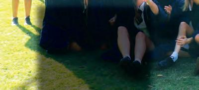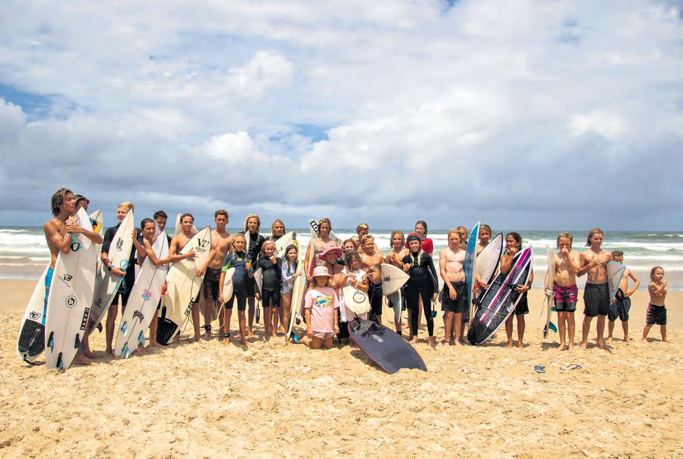 despite the on and off showers. Pictured is Julian Wilson (centre pink hat) with many of his li le proteges on Coolum Beach for his ‘Serious Fun Day’. Photo: Contributed FACES OF NORTH