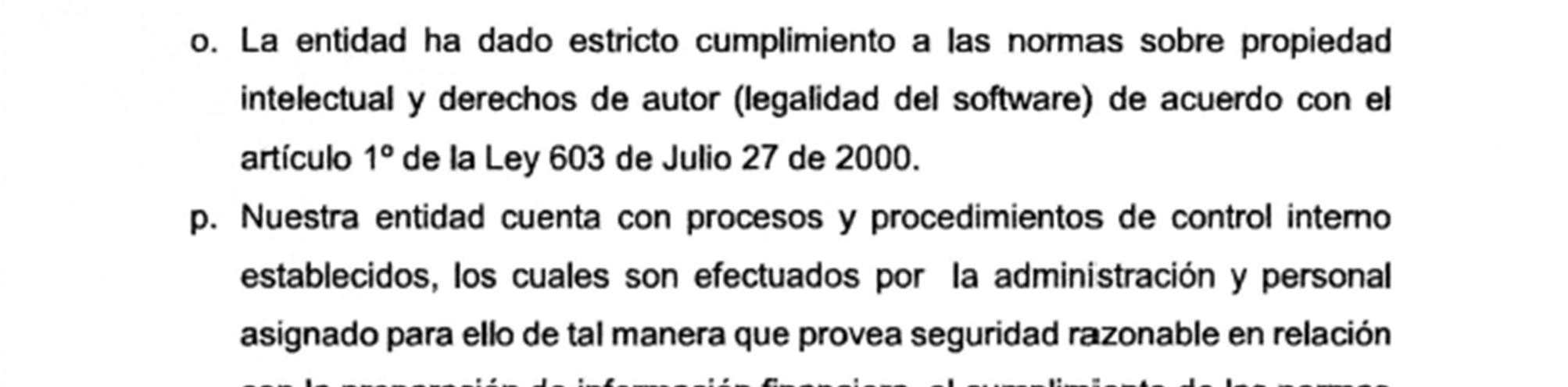 Encumplimientodel artículo 47 de la Ley 222 de 1995,modificadaconla Ley 603 del 2000, informó el estado de cumplimiento de normas sobre propiedad intelectual y derechos de