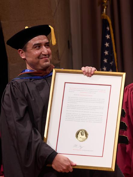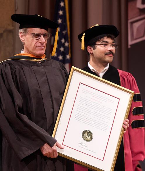 Above, l to r: George Sidebotham, retiring professor of mechanical engineering, mace bearer; Jamie Levitt, chair of the Board of Trustees; Ross Wisnewski gives invocation; Malcolm King EE’97, interim president; Shankar Vedantam, host of NPR’s Hidden Brain, was awarded an honorary doctorate and gave the commencement address; Zareena Al-Shehab ChE’25, student speaker; Ron Vogel ChE’01, president of the CUAA; Marty Sprinzen EE’70, Presidential Citation awardee, with Student Trustee Tre Brown ME’26; Acting Dean Hayley Eber AR’01 accepted the Presidential Citation on behalf of Jemuel Joseph AR’16 and Alexis Rivas AR’16; Felipe Baeza A’09, Presidential Citation awardee.