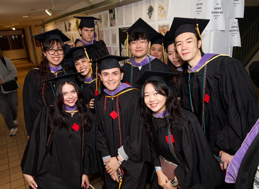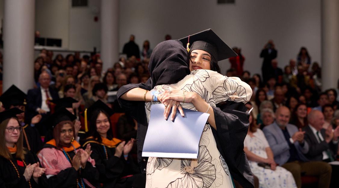 Zareena Al-Shehab ChE’25 hugs her mother after delivering the student address; Members of the school of architecture Class of 2025; School of Art grads (l to r) Zaid Arshad, Conrad Moore, Dylan Clark, and Alya Ardianto.