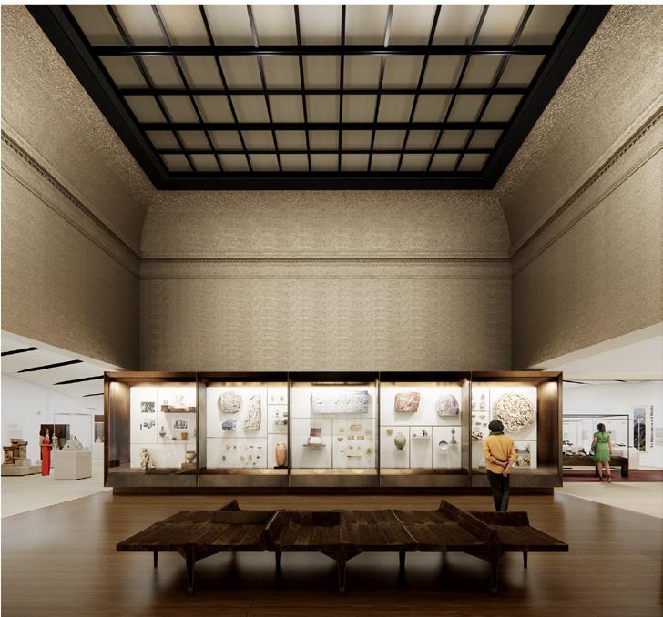 Opposite page, top: Nader Tehrani on site as the galleries undergo renovation. Below: A rendering of the Hasanlu exhibit, documenting artifacts from an ancient West Asian city of the late second to first millennium BCE in northwest Iran. Attacked and burned to the ground, the city’s charred remains ensured the physical preservation of the artifacts.